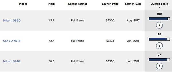 بر اساس آخرین بررسی DxO Mark، سنسور به کار رفته در دوربین عکاسی دیجیتال D850 نیکون با کسب بیشترین امتیاز در حال حاضر بهترین سنسور موجود در جهان به حساب از نظر این وب سایت به حساب می آید. پیش از این مدل های D800 و D800E نیکون نیز در سال 2012 به عنوان بهترین دوربین های عکاسی جهان انتخاب شده بودند. با این حال عملکرد D850 به گونه ای بوده که علاوه بر کسب عنوان بهترین سنسور عکاسی فعلی جهان، رکورد جدیدی نیز از خود به جا گذاشته است. بر اساس جدولی که توسط DxO Mark منتشر شده D850 نیکون با سنسور 45.7 مگاپیکسلی خود امتیاز 100 را از این وب سایت دریافت کرده است و به این ترتیب بالاتر از A7R II سونی با 98 و D810 خود این شرکت با 97 امتیاز جای دارد. البته لازم به ذکر است که این دو دوربین به ترتیب در سال های 2015 و 2014 معرفی شده اند و در نتیجه در سال های اخیر هیچ یک از محصولات جدید نتوانسته اند به رکوردهای ثبت شده توسط DxO Mark نزدیک شوند.