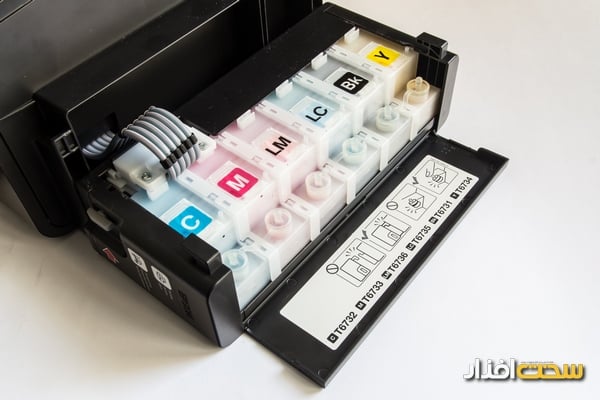 اشاره به اين نکته حائز اهميت است که سطح خارجي جعبه مستطيلي که به سمت کاربر است فاقد پوشش مشکي رنگ است و کاربر ميتواند براحتي از ميزان سطح جوهر هر تانک مطلع شود و در وقت مناسب ان را شارژ کند.