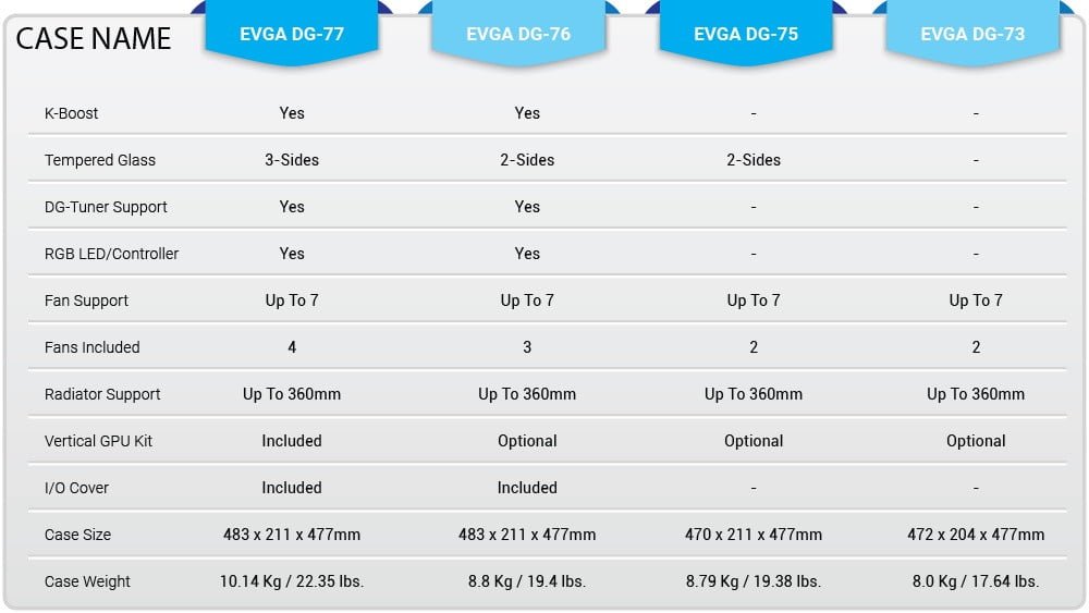 کمپانی EVGA یکی از برترین سازندگان سخت افزار که بخش بزرگی از بازار آمریکا را تحت پوشش قرار می دهد، یک خانواده از کیس های خود با نام سری DG-7 را راهی بازار می کند. این خانواده دارای 4 کیس است که در مدل های مختلف، حداقل یک و حداکثر 3 پنل شیشه ای مورد استفاده قرار گرفته است. دومین قابلیت مهم در این کیس ها، امکان نصب کارت گرافیک به صورت همیشگی و یا عمودی است.