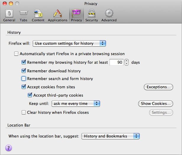 علاوه بر تنظیمات مربوط به بهروزرسانی با اعمال تنظیمات دیگر نیز میتوانید امنیت فایرفاکس را ارتقا دهید. بهعنوان مثال، براي عنوان اولین قدم در بخش تنظیمات و در قسمت General تیک عبارت Always ask me where to save files را بزنید. به اين ترتیب، اگر زمانی وبسایتی قصد ذخیره فایلی را روی سیستم شما داشته باشد به سرعت متوجه خواهید شد. مرحله بعد اعمال تنظیماتی در قسمت Privacy است. در این قسمت، همانطور که در تصویر 2 مشاهده میکنید، ابتدا در مقابل عبارت Firefox will عبارت Use custom settings for history را انتخاب کنید تا امکان تغییر تنظیمات پیشفرض وجود داشته باشد. اکنون اگر از کامپیوتر چند کاربر استفاده ميکنند، تیک عبارت Remember search and form history را بزنید تا فرمها و درخواستهای نام کاربری و کلمه عبور بهطور خودکار پر نشوند. از سوی دیگر، اگر در مورد کوکیهایی که از سوی سایتهای مختلف در کامپیوتر ذخیره میشوند، مطمئن نیستید میتوانید در مقابل عبارت Keep until گزینه Ask me every time را انتخاب کنید. البته در نظر داشته باشید، با انتخاب این گزینه با هر بار ورود به هر سایتی در مورد موافقت یا عدم موافقت ذخیره کوکیها از شما سؤال میشود و این ممکن است به مرور زمان برایتان ناخوشایند باشد. مرحله بعد، چک کردن گزینه Warn me when sites try to install add-on در قسمت Security است. با فعال کردن این گزینه، زمانی که یک سایت برای نصب افزونهای روی سیستم شما تلاش میکند، پیغامی نمایش داده میشود. آخرین مرحله نیز همانطور که در تصویر 3 نمایش داده شدهاست، بررسی فعال بودن گزینه Block pop-up windows (برای جلوگیری از نمایش پنجرههای pop-up) در قسمت Content است. البته اگر میخواهید خیلی سختگیر باشید، میتوانید در همین قسمت، گزینه Enable JavaScript (برای جلوگیری از اجرای اپلیکیشنهای ناشناس توسط سایتها) را غیرفعال کنید که البته من این را پیشنهاد نمیکنم.