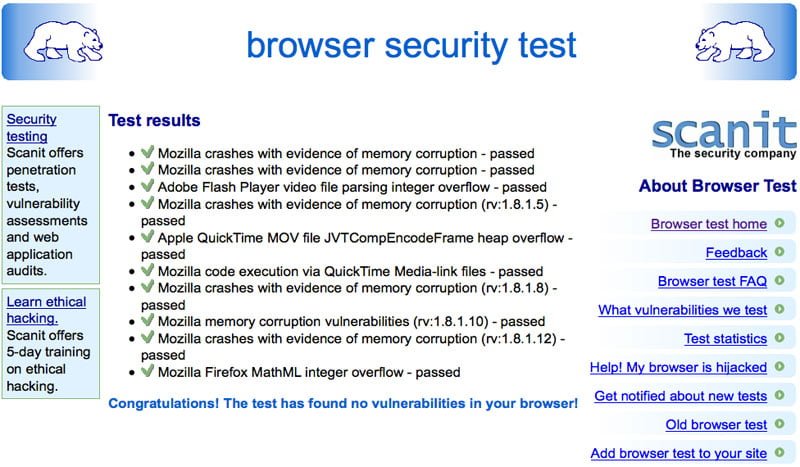 آخرین مرحلهای که در این مطلب به آن خواهم پرداخت، بررسی و آزمایش میزان امنیت مرورگر توسط سایتهایی است که به همين منظور طراحی شدهاست. بهعنوان مثال، در آدرس http://bcheck.scanit.be/bcheck/index.php میتوانید مرورگر خود را از نظر امنیتي بررسی کنید. تنها کافیست نوع آزمایش را مشخص کنید و سپس روی دکمه Start the test کلیک کنید. پس از دقایقی نتیجه آزمایش مانند چیزی که در تصویر 4 شاهد آن هستید، نمایش داده خواهد شد.