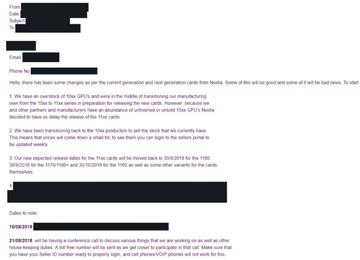 این ایمیل نشان می دهد که کارت گرافیک های GeForce GTX 1180، GeForce GTX 1170/1180+ و GeForce GTX 1160 به ترتیب در تاریخ های 30 آگوست، 30 سپتامبر و 30 اکتبر راهی بازار خواهند شد. این ایمیل به نکته دیگری نیز اشاره دارد که کنفرانس خبری انویدیا در تاریخ 21 آگوست است. در صورتی که تاریخ های فوق درست باشند، احتمالا در زمان های فوق شاهد ارائه مدل های رفرنس هستیم.