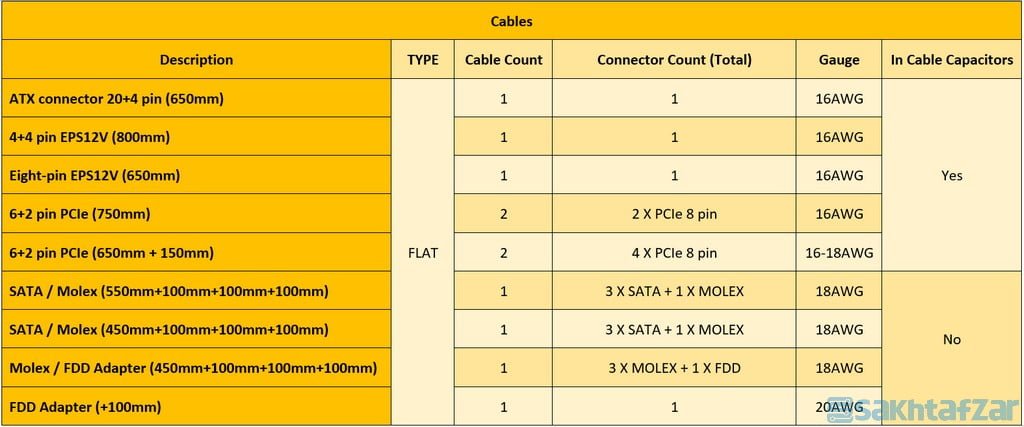 تمامی کابل های این پاور فلت می باشند. تنوع بسیار خوبی دارند. این پاور مجهز به دو کابل EPS برق پردازنده است، از این رو می توان آن را برای مادربرد های High End مجهز به دو ورودی برق پردازنده مورد استفاده قرار داد.