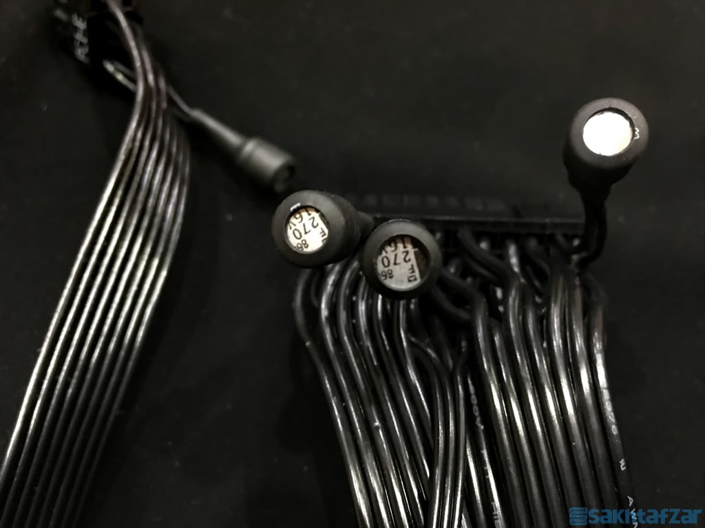 دو عدد کابل برق ساتا بر روی هر کدام سه سوکت برق SATA و در انتها یک مولکس قرار دارد. فاصله سوکت ها فقط 10 سانتیمتر است که البته اگر این فاصله 15 سانتیمتر بود مدیریت کابل کشی راحت تر می شد.