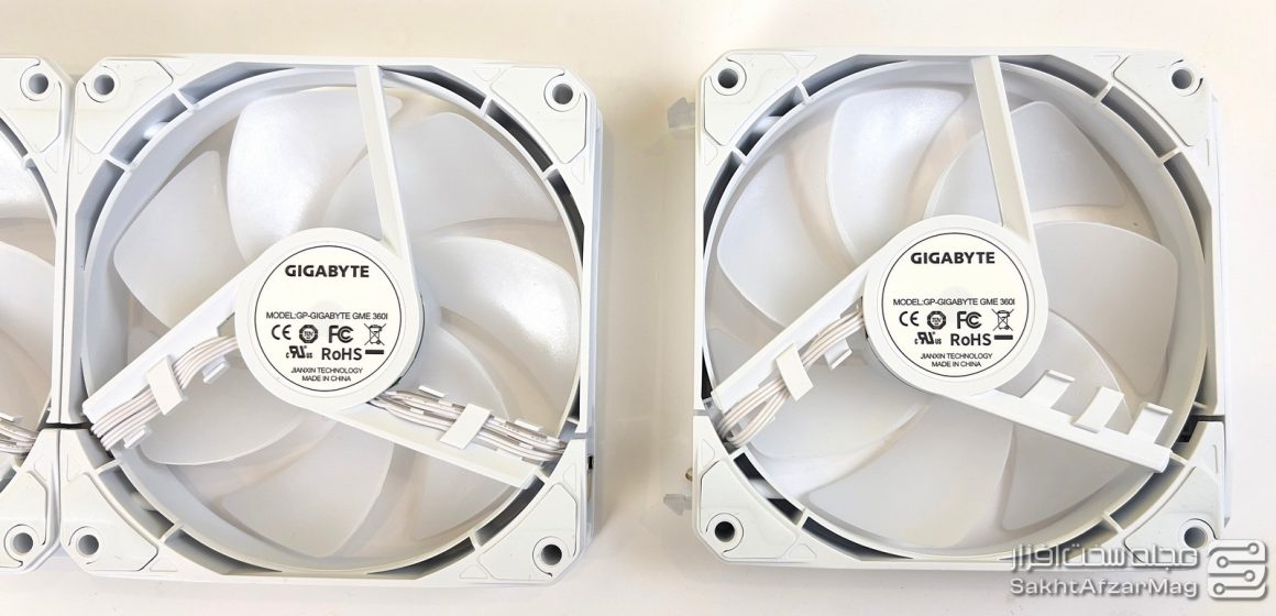 واترکولر GAMING 360 ICE گیگابایت دارای 3 فن جدید است که اتصال آنها به یکدیگر به صورت کشویی انجام می‌شود. هیچ کابلی از این فن‌ها خارج نشده و تمام اتصالات به صورت اتصال فیزیکی بین فن‌ها برقرار است و در انتها فقط 2 سیم از طریق اتصال ماژولار، از یکی از فنها خارج می‌شود.