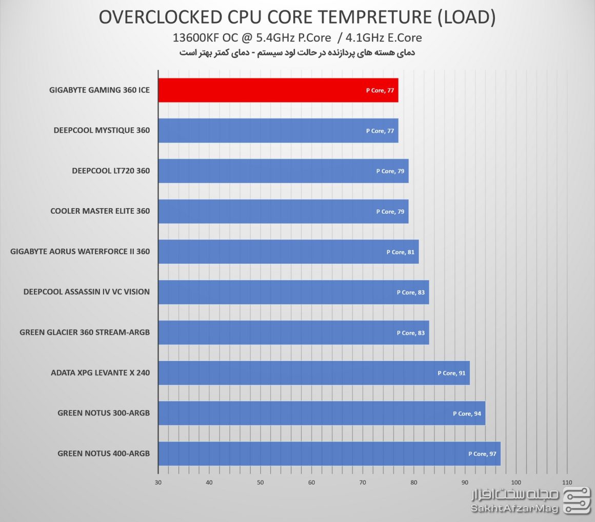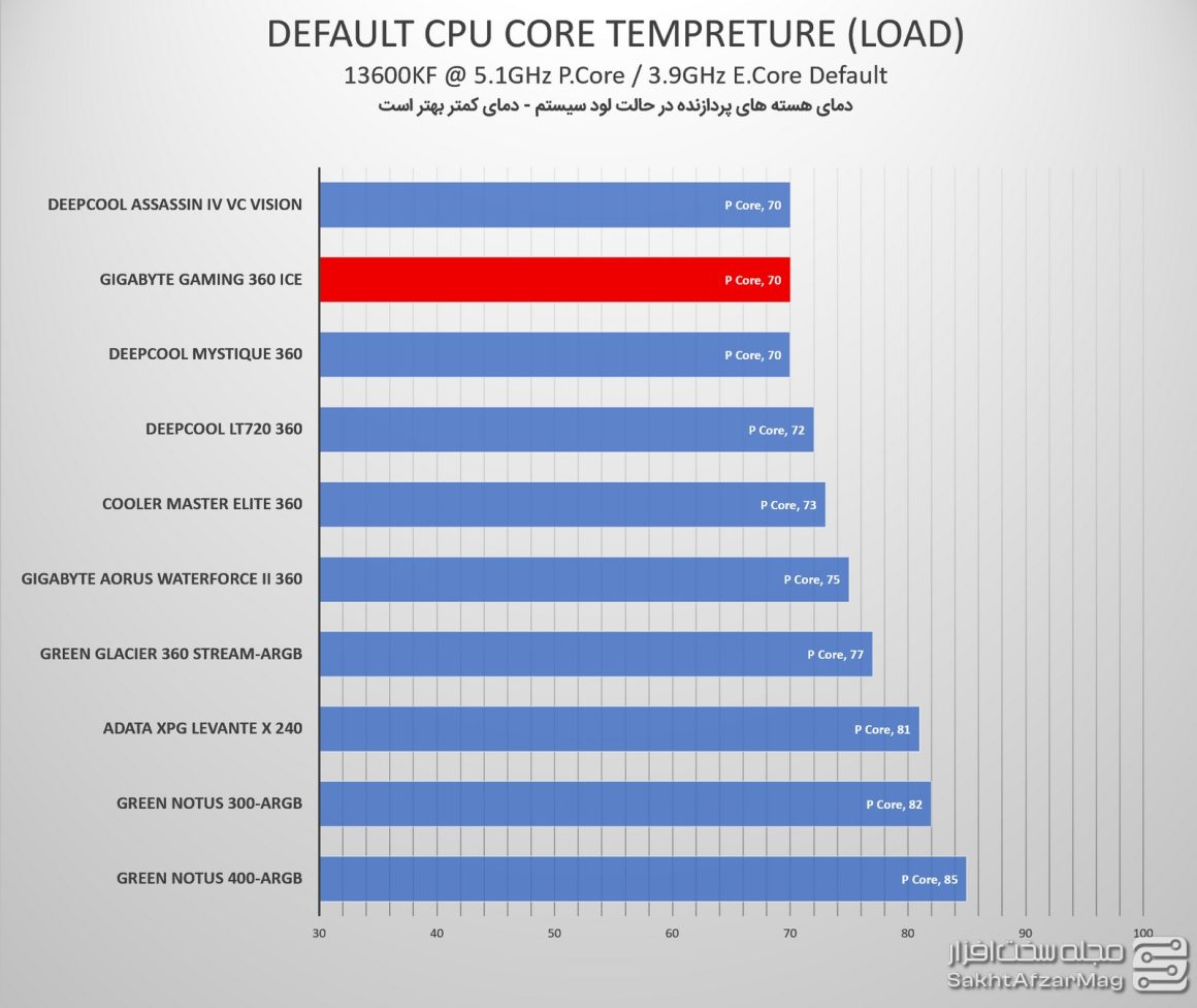 واترکولر GAMING 360 ICE گیگابایت به هنگام لود پردازنده در تنظیمات دیفالت، توانست با ثبت دمای 70 درجه، در صدر جدول قرار گیرد.