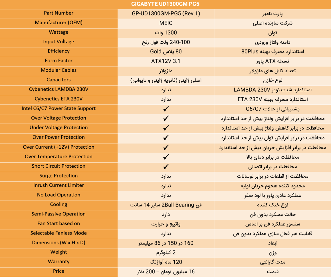 پاور UD1300GM PG5 گیگابایت استاندارد راندمان مصرف 80Plus طلایی دارد. این پاور مجهز به شش سامانه‌های محافظتی OPP/OVP/OTP/OCP/SCP/UVP است. این پاور مبتنی بر پلتفرم ATX 3.0 اینتل ساخته شده است.