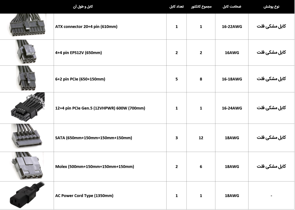 در پشت جعبه مشخصات کابل‌ها، اندازه آنها و جدول توزیع قدرت پاور در ریل‌های مختلف را مشاهده می‌کنید.