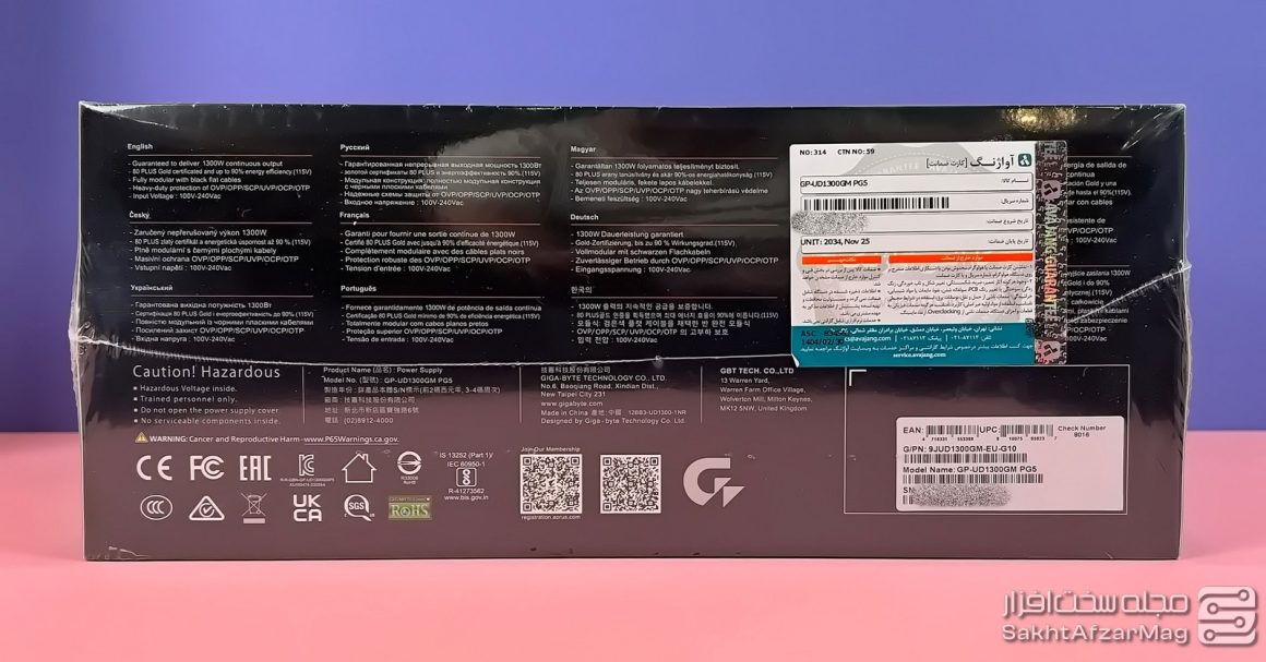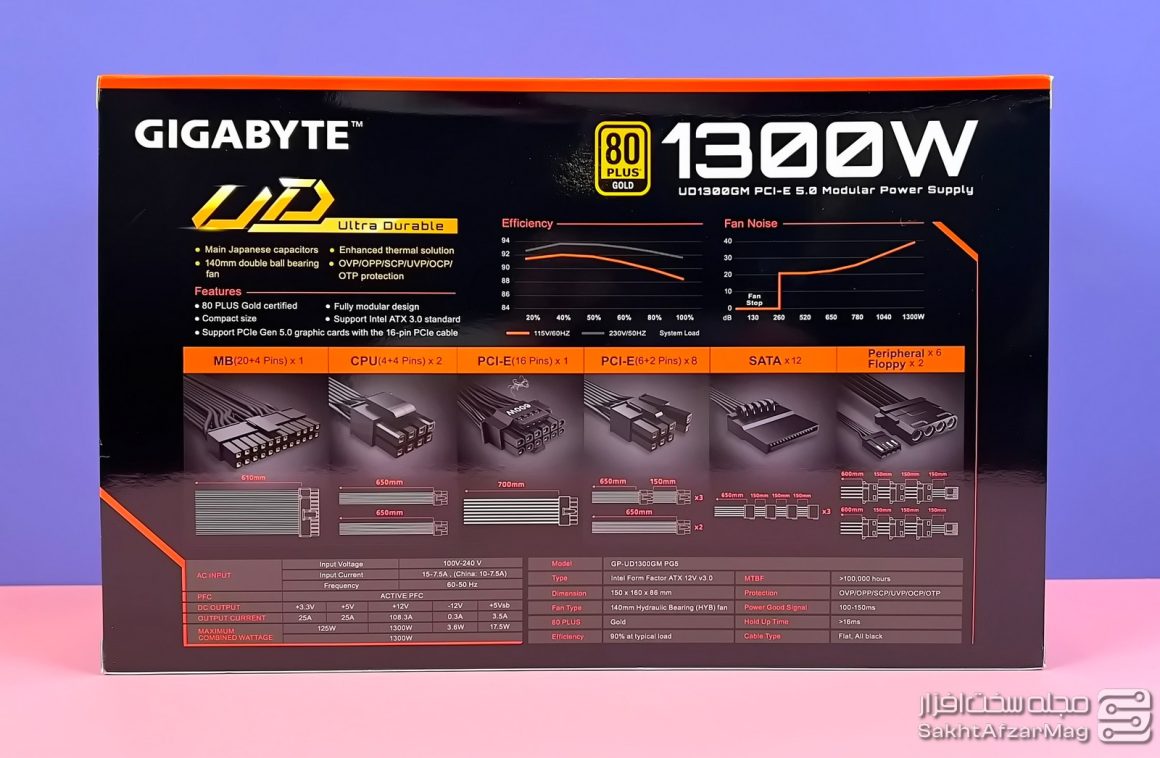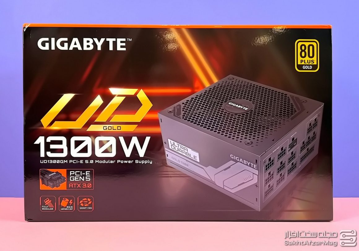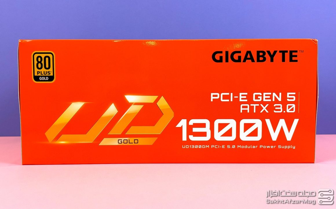 جعبه پاور UD1300GM PG5 گیگابایت رنگی است و طرح پاور و آرم ATX 3.0 به همراه نشان خازن‌های ژاپنی و فن 14 سانتیمتری را روی جعبه را در تصویر فوق مشاهده می‌کنید.
