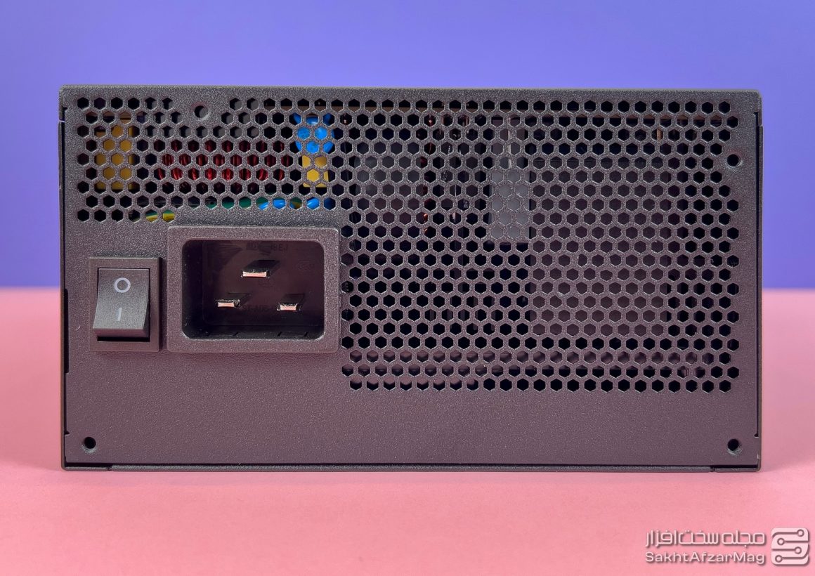 در پشت پاور فقط سوئیچ روشن و خاموش قرار دارد. دقت داشته باشید، اتصالات فلزی برق در این پاور استوانه‌ای نیست و به‌صورت فلزی خطی است، بنابراین فقط کابل برق منحصربه‌فرد خود پاور به آن متصل می‌شود.