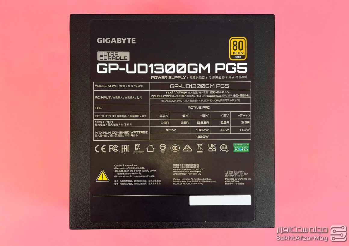 ابعاد پاور UD1300GM PG5 گیگابایت برابر 160 در 150 در 86 میلیمتر است. این نما سمت کاربر قرار می‌گیرد.