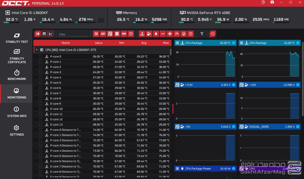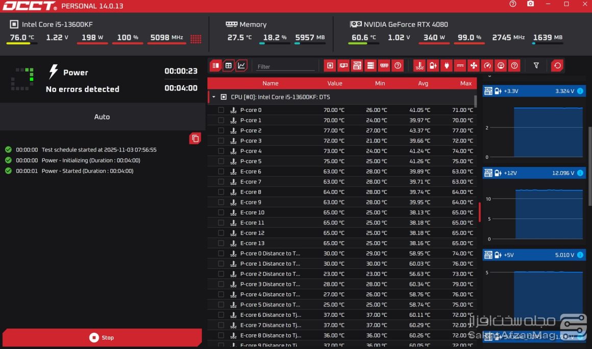 اگرچه تست پاور نیاز به تجهیزات دقیق آزمایشگاهی دارد، اما ما در حد توان با استفاده از خوانش‌های نرم‌افزاری، به بررسی این پاور می‌پردازیم. برای تست نوسان ریل‌ها و ولتاژ پاور، از نرم‌افزار OCCT استفاده کردیم.