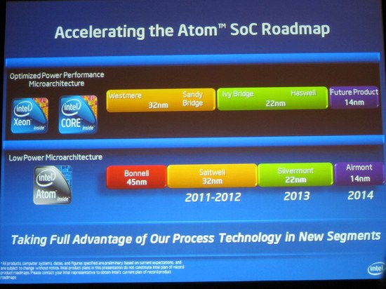 همچنین اینتل اعلام کرده که امسال و سال آینده شاهد عرضه پردازنده های 32 نانومتری اتم خواهیم بود. سال 2013 پردازنده های 22 نانومتری و در سال 2014 پردازنده های 14 نانومتری در اختیار مصرف کنندگان قرار خواهد گرفت.