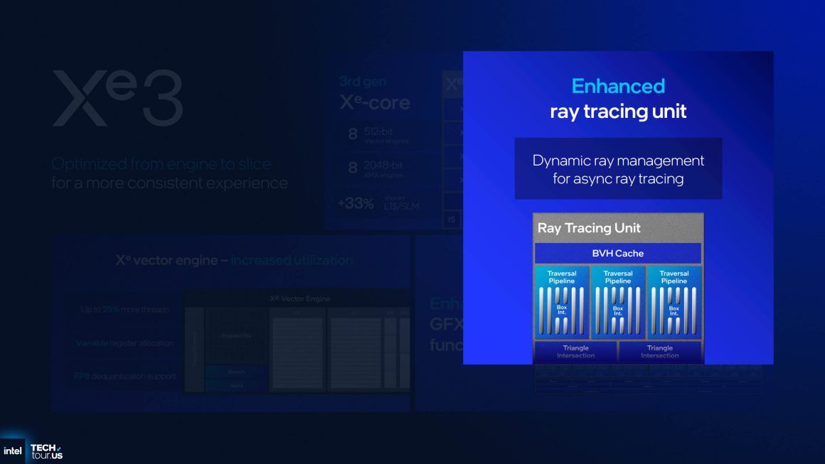 واحد ردیابی پرتو بهبودیافته Xe3 از مدیریت پویای پرتو برای ردیابی پرتو ناهمزمان استفاده میکند. این واحد شامل چندین خط لوله پیمایش، دو واحد تقاطع مثلثی و حافظه نهان BVH است. بهبودها از طریق کاهش سرعت ارسال پرتوهای جدید برای جلوگیری از انسداد در واحد مرتبسازی رشتهها حاصل شده است. مدیر جدید URB امکان بهروزرسانیهای جزئی را فراهم کرده و نیازی به بازنویسی کامل ندارد. معماری جدید همچنین تا 2 برابر فیلترگذاری ناهمسانگرد و نرخ آزمون شابلون را ارائه میدهد.