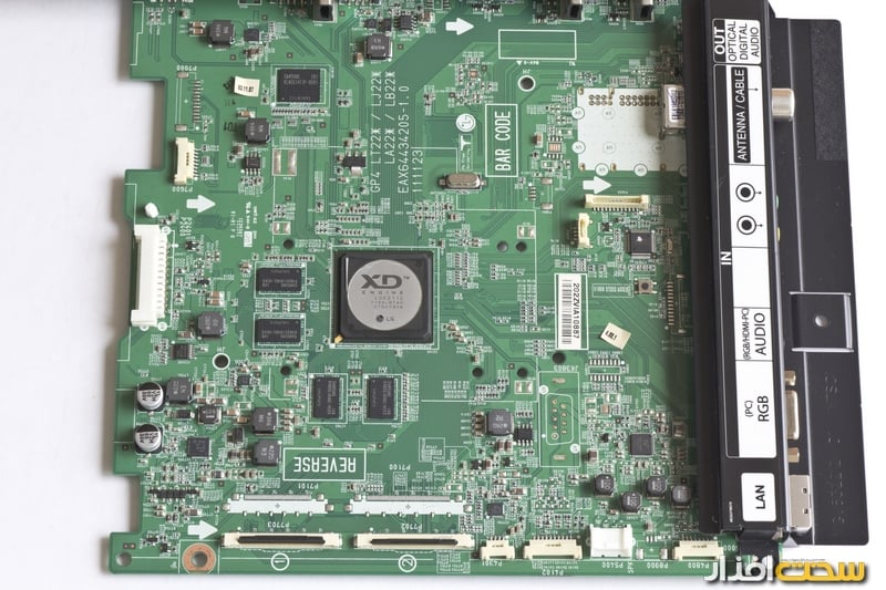 زير اين خنککننده، پردازنده اختصاصي XD Engine Triple و چهار چيپست حافظه دو گيگابايتي DDR3 1600 در اطراف آن تعبيه شدهاست. اگر کمي با دقت به تصوير نگاه کنيد، خواهيدديد الجي با تعبيه اين پردازنده تقريباً تمامي چيپستهاي ديگري را که در نسل قبل وجود داشت، در يک پردازنده مجتمع کرده و با اينکار بهگونهاي توان مصرفي را نيز کاهش دادهاست. علاوه بر اين، درست در سمت پورتهاي USB، يک Multichip با شماره مدل KLM2G1HE3F-B001 قرار دارد که براساس اطلاعات به دست آمده، داراي ظرفيت دو گيگابايت و قابليت برنامهريزي است. بهطور حتم، اطلاعات مربوط به بخش اسمارت، در اين قسمت ذخيره ميشوند و هنگامي که نرمافزار تلويزيون را بهروزرساني ميکنيد، اطلاعات مربوطه در اين چيپست ذخيره ميشوند (تصوير 10، LM67100 و 11، LW65100)
