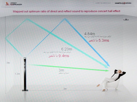این سیستم طوری عمل می کند که سه موج صدا به شما می رسد. موج اول بلافاصله از سمت بلندگوها به شما می رسد، موج دوم صدایی است که به سقف برخورد کرده و با 5.3 میلی ثانیه تاخیر به گوش می رسد و موج سوم ابتدا به دیوار و سپس به سقف برخورد کرده و با 9.4 میلی ثانیه تاخیر با گوش شما می رسد و باعث می شود شما حس سه بعدی بودن صدا و شنیدن آن از اطراف و بالای سر خود را داشته باشید و حس حضور در سالن کنسرت را تجربه کنید.