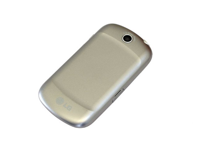 با برگرداندن گوشی، اولین چیزی که خودنمایی میکند لنز دوربین است که در بالای آن کلمه 3 مگاپیکسل حک شده است. قاب پشتی یک سطح مات نقرهای شکل دارد که اثر انگشت روی آن باقی نمیماند. از آنجاییکه این قاب به صورت یک تکه طراحی شده، برای دسترسی به باتری باید آنرا بهطور کامل جدا کرد که این امر به کمک شیار کوچک بالای گوشی میسر میشود (وقتی ما قاب را برداشتیم، به خودمان گفتیم، عجب پلاستیک بیکیفیتی!). در زیر این قاب، باتری 1280 میلیآمپری قرار دارد که برای درآوردن آن مجبور هستید گوشی را با حرکاتی متحیرالعقول! به سمت بالا و پایین حرکت دهید تا بلکه باتری رضایت به درآمدن بدهد! البته خوشبختانه تنها برای دسترسی به سیمکارت مجبورید تا با باتری سر و کله بزنید و به شیار کارتحافظه بدون آنکه بخواهید انرژی اضافهای صرف كنيد، دسترسی خواهید داشت (نکته عجیبی که در اینجا وجود دارد این است که چرا الجی با ایجاد یک برش کوچک روی قاب بیرونی، دسترسی به کارت حافظه را بدون نیاز به درآوردن قاب فراهم نکرده است).