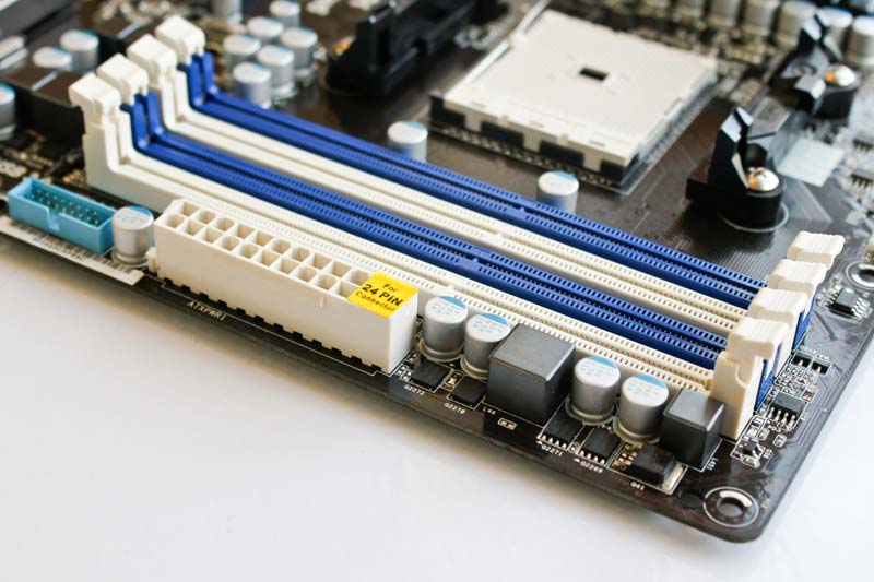 چهار اسلات حافظه با رنگهاي آبي و سفيد در اين مادربورد با فاصله به نسبت كمي در كنار كانكتور 24 پين منبع تغذيه تعبيه شده است.