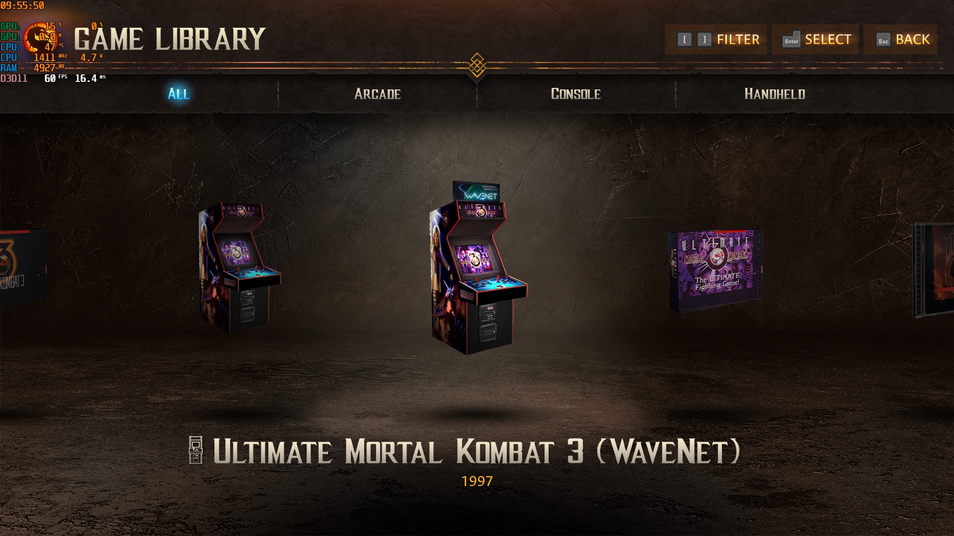 به بیان دقیقتر، کارت گرافیک NVIDIA GeForce MX350 یک گزینه قوی برای سیستمهای مقرونبهصرفه به شمار میآید که معمولاً برای کارهای سبک و اجرای بازیهای معمولی مناسب است. این کارت گرافیک، گزینه قابلتوجهی برای انجام بازیهای سنگین و AAA محسوب نمیشود. در منوی اصلی کالکشن MK Legacy، ما 11 بازی مختلف از این سری محبوب را میبینیم. طراحی منو بسیار جذاب و دلنشین است؛ گرچه برخی از کاربران اعتقاد دارند که استودیوی Digital Eclipse از هوش مصنوعی مولد (Generative AI)، برای طراحی منو استفاده کرده است. در حین جستجوی بازی در منوی کالکشن MK Legacy، بسامد نرخ فریم بهصورت ثابت روی عدد 60 قرار دارد.