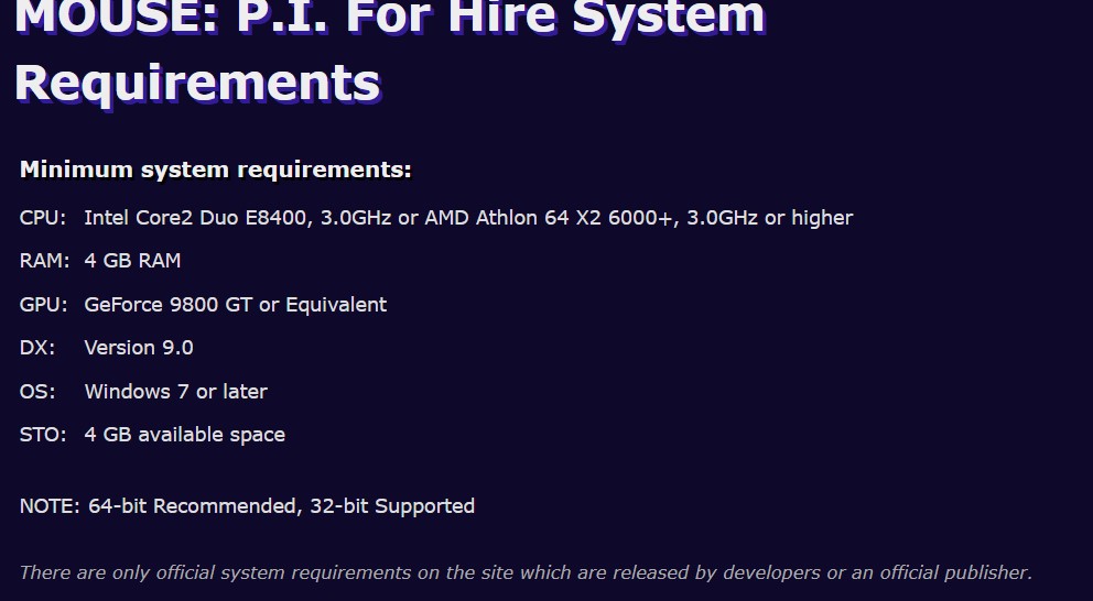 علاوهبرآن، حجم بازی موردبحث از 4 گیگابایت، به 32 گیگابایت افزایش یافته است. نسخه PC بازی Mouse: P.I For Hire از سیستمعامل Windows 10 64-bit یا جدیدتر پشتیبانی خواهد کرد و دیگر خبری از گزینه قدیمی Windows 7 در بهروزرسانی سیستم مورد نیاز این بازی نیست. بااینحال، مؤلفههای پردازنده (CPU) برای اجرای بازی Mouse: P.I For Hire تغییر نکرده است. این احتمال وجود دارد که مشخصات فنی بازی مزبوز میتواند در آستانه انتشار دوباره تغییر کند.