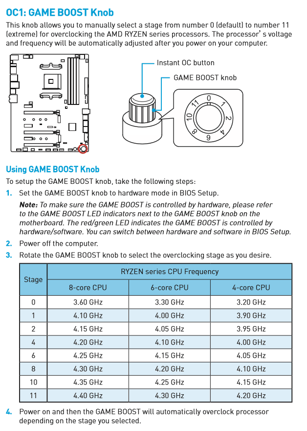 در نتیجه حتی فرکانس های 5.2 گیگاهرتز نیز توسط این پردازنده و قابلیت Game Boost در مادربردهای MSI دست یافتنی است؛ اما به تازگی اطلاعات از مادربردهای این شرکت در سوکت AMD AM4 منتشر شده است که یک وضعیت مشابه در پردازنده های AMD Ryzen را نمایش می دهد. قضیه از این قرار است که پردازنده های 6 و 8 هسته ای AMD مانند Ryzen 7 1800X, Ryzen 7 1700X و Ryzen 7 1700 که به تازگی معرفی شده اند، در مادربردهای جدید MSI به صورت خودکار اورکلاک خواهند شد. این کمپانی فناوری Game Boost را در این مادربردها نیز پیاده سازی کرده و در حداکثر 11 مرحله، پردازنده های مورد بحث را تا فرکانس 4.40 گیگاهرتز اورکلاک خواهد کرد. همانطور که می دانید، اکثر فرکانس های این پلتفرم زیر 4.0 گیگاهرتز است. این ابزار علاوه بر سازندگان، برای کاربران نیز کارایی بالایی را به همراه دارد؛ به دور از پیچیدگی های بایوس و اشتباهات مرسوم، می توان تنها با اتکا به یک قابلیت (Game Boost) فرکانس پردازنده ها را اورکلاک نمود. در همین راستا اسلاید هایی از این تولید کننده منتشر شده است که اوج فرکانسی هسته ها را در دو پلتفرم AMD Ryzen و Intel KabyLake نمایش می دهد. در جدول زیر پردازنده هایی (به جز اینتل) که قادر به نصب بر روی مادربردهای MSI هستند و از ویژگی Game Boost نیز برخوردار خواهند شد، درج شده است.