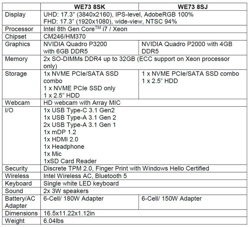 لپ تاپ های سری WE دومین محصولات قابل توجه در این حوزه هستند؛ MSI در WE های 2018 از کارت گرافیک های NVIDIA Quadro در کنار پردازنده های Xeon نسل هشت استفاده کرده است.