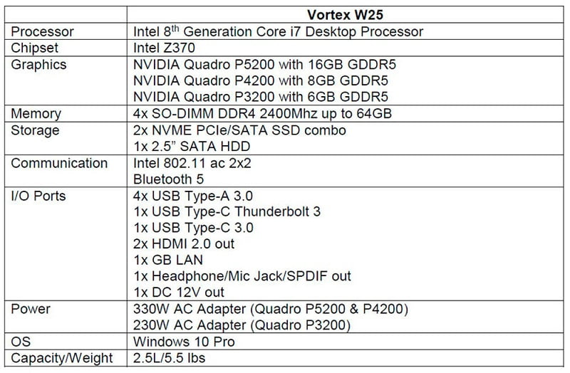 کامپیوتر Vortex W25 برای مهندسان و کاربرانی است که نیازمند یک کامپیوتر قدرتمند و جان سخت به منظور کاربردهای طولانی مدت در کلاس ایستگاه کاری هستند. این محصول از تراشه Z370 بهره گرفته و از CPU های Core i7 نسل هشتم اینتل بهره می برد. کارت گرافیک های NVIDIA Quadro در آن به انجام وظیفه می پردازند. خنک کننده اختصاصی Cooler Boost Titan در کنار این گروه قرار دارد. W25 موفق به دریافت تمامی تائیدیه های Autodesk Revit, ANSYS, Autodesk Moldflow و Dassault Catia شده است. دیگر مشخصات فنی را می توانید در اسلاید مطالعه نمائید.
