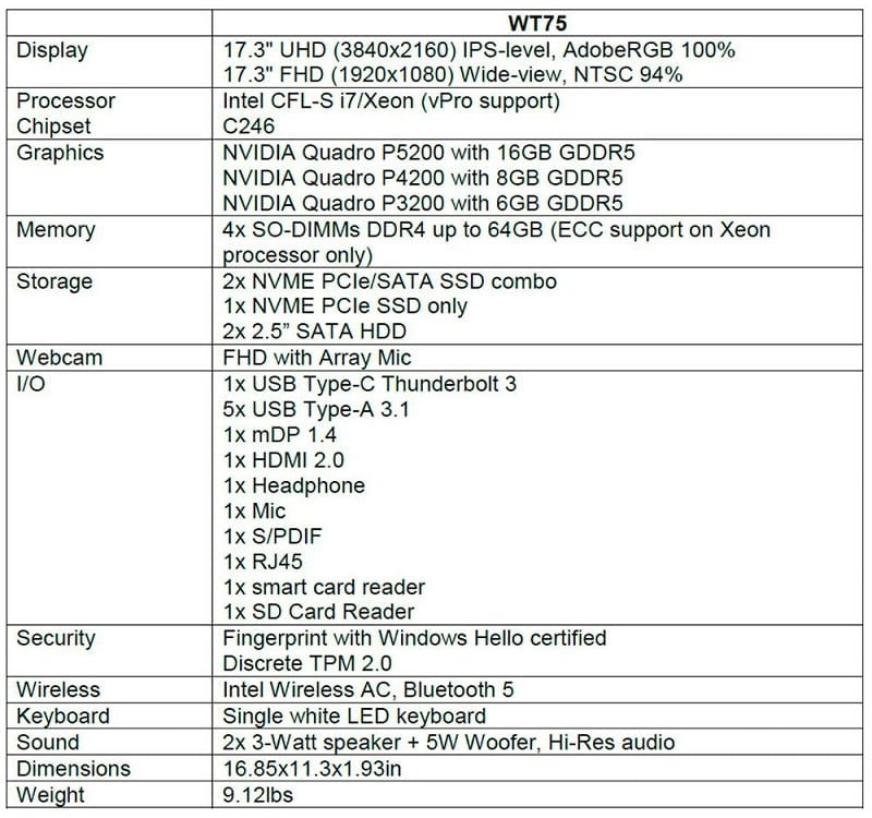 و اما غول های پردازشی WT75 که لپ تاپ های ایستگاه کاری با CPU های Xeon کلاس دسکتاپ هستند! سری WT75 نیز از کارت گرافیک های NVIDIA Quadro استفاده خواهند کرد. در نتیجه عملکرد آنها در بخش گرافیکی تا 40% به نسبت کارت گرافیک های مکسول، و تا 50% به نسبت CPU های نسل گذشته و کلاس لپ تاپ، افزایش یافته است.