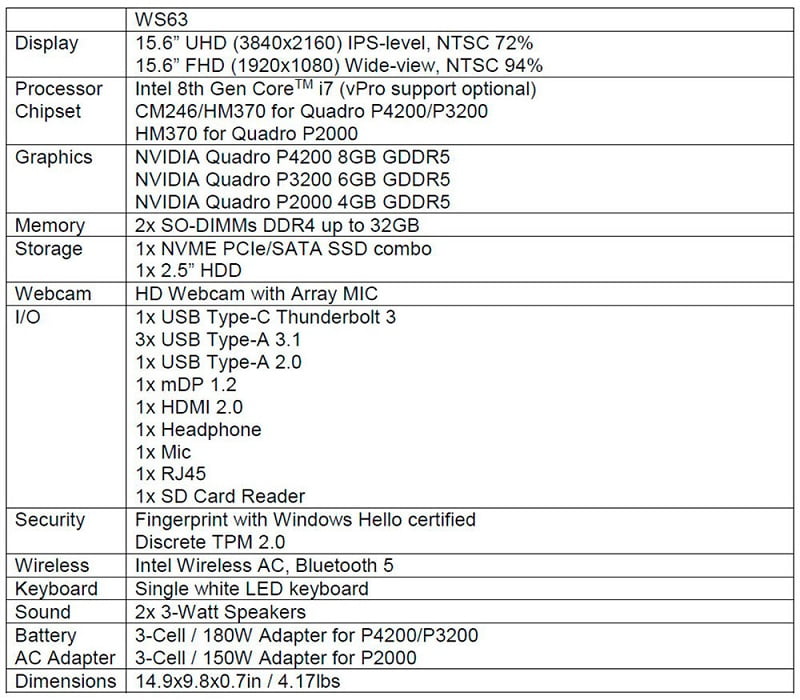 در نهایت سری شیک و زیبای WS63 را شاهد هستیم؛ این گروه با استفاده از خنک کننده Cooler Boost Trinity، دارای گردش تهویه تا 20% بیشتر بوده و با استفاده از کارت گرافیک های NVIDIA Quadro به همراه CPU های نسل هشتم اینتل، سرعت پردازشی تا 40% سریعتر را ارائه خواهند کرد. حسگر اثر انگشت و Windows Hello به همراه پشتیبانی از فناوری Intel vPro از جمله دیگر ویژگی های WS63 ها به شمار می رود.