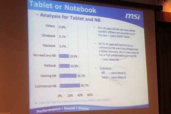 سپس نموداری از میزان درخواست و نیاز کاربران به تبلت ها و نوت بوک ها به نمایش در آمد. طبق گفته مسئولان msi و تحقیقات صورت گرفته، 81 درصد کاربران تبلت در اختیار ندارند و 60 درصد آنها دوست دارند که یک تبلت داشته باشند. اما در عین حال 40.7 کاربرانی که قبلاً تبلت در اختیار داشته اند، اعلام کردند که به یک نوت بوک تجاری برای انجام امور خود نیاز دارند. 34.1 درصد نیز بیان کرده اند که میخواهند یک نوت بوک با کارایی بالا و از سری نوت بوک های مخصوص بازی تهیه نمایند.