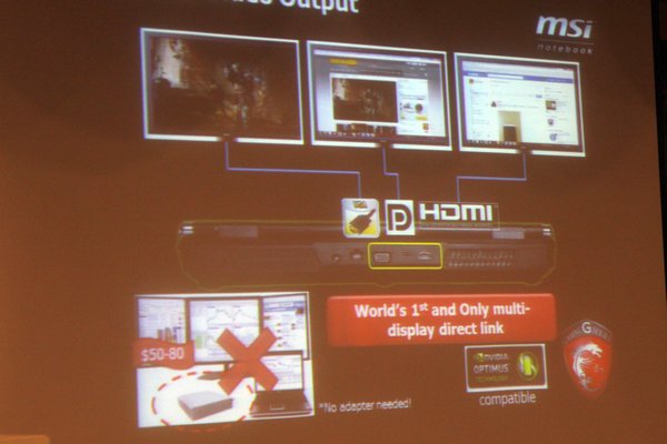 نوت بوک های جدید مخصوص بازی msi دارای خروجی های تصویر DisplayPort، HDMI و D-Sub هستند و به کمک آنها میتوان علاوه بر تصویر صفحه نمایش نوت بوک، سه تصویر مجزای دیگر را نیز روی سه صفحه نمایش متصل به نوت بوک مشاهده کرد. بدین ترتیب میتوان در زمان بازی به چک کردن ایمیل ها نیز پرداخت و امور دیگر را تحت نظر گرفت.