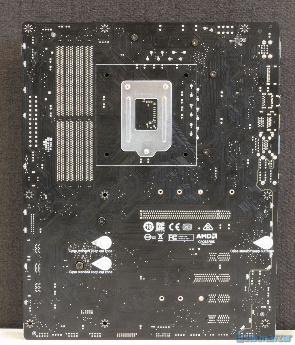 نکته ای که باید در مورد پشت مادربرد گفته شود، نصب تعداد زیادی LED های RGB در پشت مادربرد است که بخصوص در لبه ی سمت راست و همچنین در زیر بخش صوتی تجمع کرده اند. این توزیع LED در زیر مادربرد صحنه های بسیار خیره کننده ای از رقص نور را پدید می آورد.