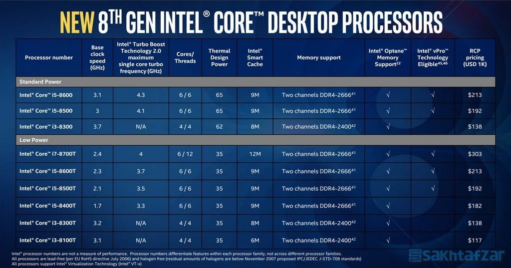 اینتل همچنین یکسری پردازنده جدید به خانواده Coffee Lake اضافه کرده است، که شاید مهمترین آنها i5 8600 و i5 8500 هستند که جای خالی فاصله ما بین پردازنده های فعلی i5 8400 و i5 8600K را پر می کنند و در رده ی پایین هم پردازنده جدید الورود i3 8300 بالاتر از i3 8100 خواهد ایستاد.
