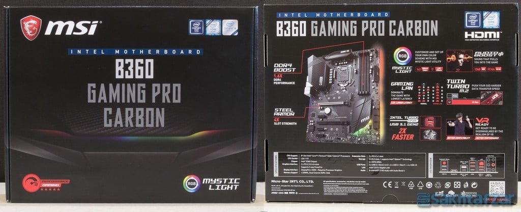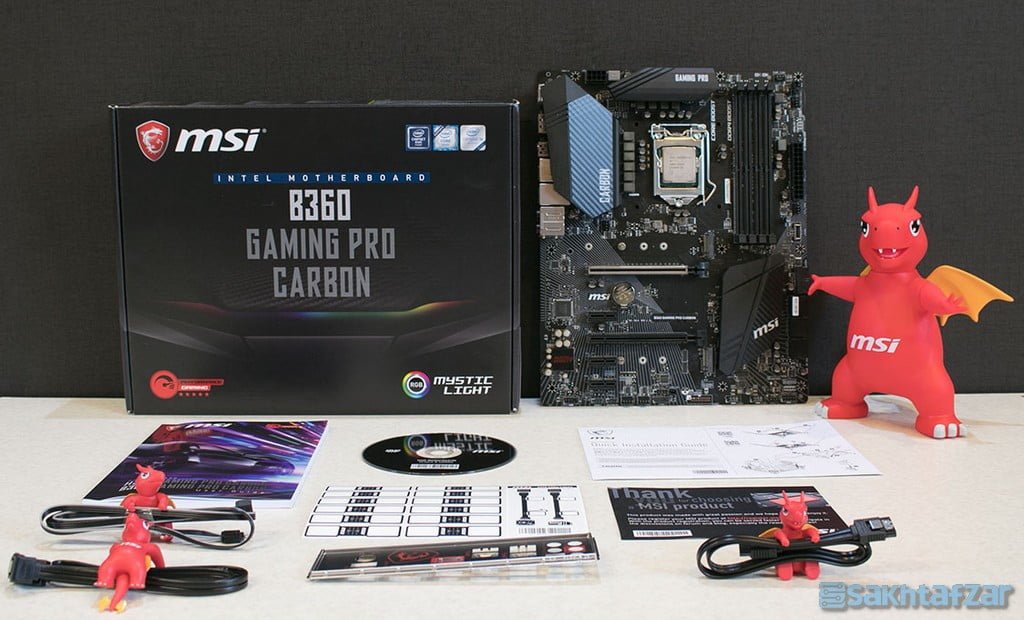 مادربرد MSI B360 GAMING PRO CARBON در ابعاد استاندارد ATX ساخته شده است. از امکانات این مادربرد مجهز به چیپ B360 می توان به چهار اسلات رم DDR4 که در مجموع 64 گیگابایت رم که تا فرکانس 2666 مگاهرتز را پشتیبانی می کند اشاره کرد. همچنین دو اسلات PCIE Gen.3 گرافیک که می توانند همزمان در حالت (x16/ x4) فعالیت کنند به همراه دو سوکت M.2 که فقط یکی از آنها می تواند تا 32GB/s و دیگری تا 16GB/s سرعت نقل و انتقال داده ها داشته باشد، وجود دارند. مجموع 5 عدد هدر PWM/DC مخصوص فن کیس، یک هدر برای فن پردازنده، یک هدر برای پمپ واتر کولر، مجموع چهار درگاه USB 2.0، دو درگاه USB 3.1 Gen.1، سه عدد خروجی USB 3.1 Gen.2 که در I/O پنل مادربرد و یک خروجی هم برای فرانت پنل کیس قرار دارد، ورودی PS/2، همچنین یک ورودی Lan گیگابیتی متصل به کنترلر Intel I219-V، شش عدد درگاه SATA III 6G، یک عدد خروجی 12 ولت LED RGB 5050، یک عدد خروجی 5 ولت از نوع WS2812B برای اتصال به رشته های LED رنگین کمانی، و در انتها خروجی های تصویر Display Port و HDMI مخصوص گرافیک مجتمع پردازنده که در I/O پنل مستقر می باشند همه از امکانات فراوان این مادربرد به شمار می روند.