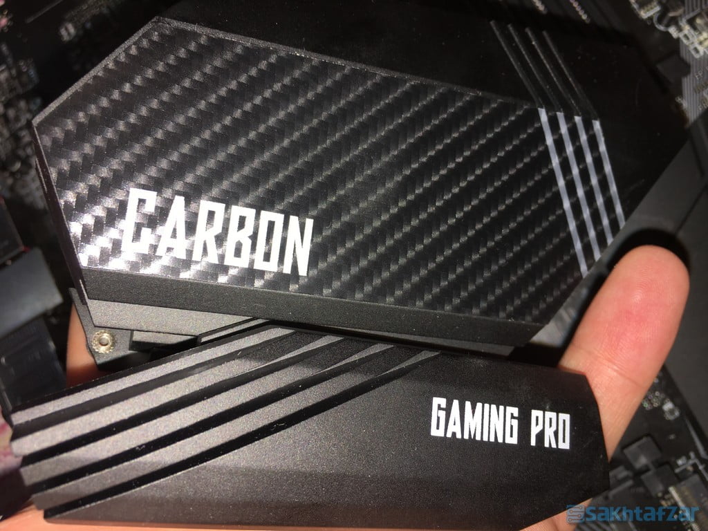 مادربرد کربن، همانطور که از اسمش بر می آید زیبایی مشکی و طرح فیبر کربن را بر روی سینک های خنک کننده خود دارد که انصافا از کیفیت و تراش کاری فوق العاده ای برخوردار هستند. این سینک ها از آلیاژ فلزی خنک و سنگین هستند. با برداشتن آنها به سراغ مدار تغذیه مادربرد می رویم.
