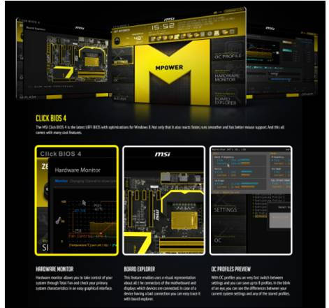 پیش از این تصاویری از سوکت، مدار رگولاتور و خنک کننده آن منتشر شده بود و حالا میدانیم در این سری از مادربوردها، بایوس به نسخه ClickBIOS 4 ارتقا یافته است. از تصاویر این نکته بر می آید که یک حالت ساده و سریع برای بایوس و بخش های مختلف در نظر گرفته شده و همانند خود مادربورد و جعبه آن، از رنگ های مشکلی و زرد در طراحی آن استفاده شده است.