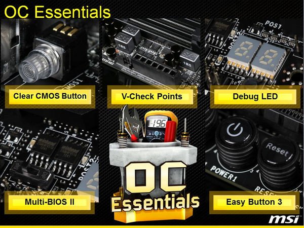 ابزارهای متعددی برای اورکلاکر ها نیز در نظر گرفته شده است که البته نکته جدید و خاصی در آنها دیده نشده و نمونه آنها را قبلاً در مادربوردهای دیگر نیز دیده بودیم. Debug LED، بخشی برای خواندن ولتاژ، دکمه پاک کردن بایوس، دکمه های روشن و خاموش و ریست و تغییر ولتاژ و دو بایوس برای استفاده در مواقع اضطراری جزو مواردی هستند که msi برای اورکلاک در نظر گرفته است.