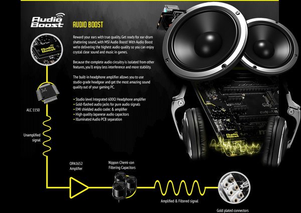 صدا نیز بخش دیگری است که msi روی آن تمرکز داشته است. در این مادربوردها همپنان از چیپست Realtek ALC 1150 استفاده شده است، اما ویژگی Audio Boost صدای خروجی را تقویت کرده و سعی در افزایش کیفیت صدا دارد. مدار صوتی مادربورد از دیگر بخش ها جدا بوده و دارای خازن های اختصاصی Nippon Chemi-con برای فیلترینگ و همچنین محافظی در برابر اختلالات الکترومغناطیسی است.