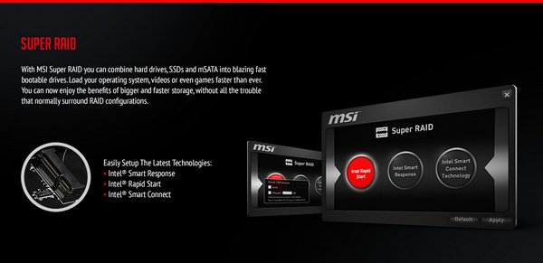 در نهایت ویژگی Super RIAD با استفاده از درایو های SSD (متصل به پورت SATA یا mSATA) امکان استفاده از فناوری های Intel SmartResponse و Intel Rapid Start را به سادگی فراهم میسازد تا کاربر بدون دردسر از سرعت بالا در بوت شدن سیستم عامل یا اجرای سریعتر نرم افزار ها و بازی ها بهره ببرد.