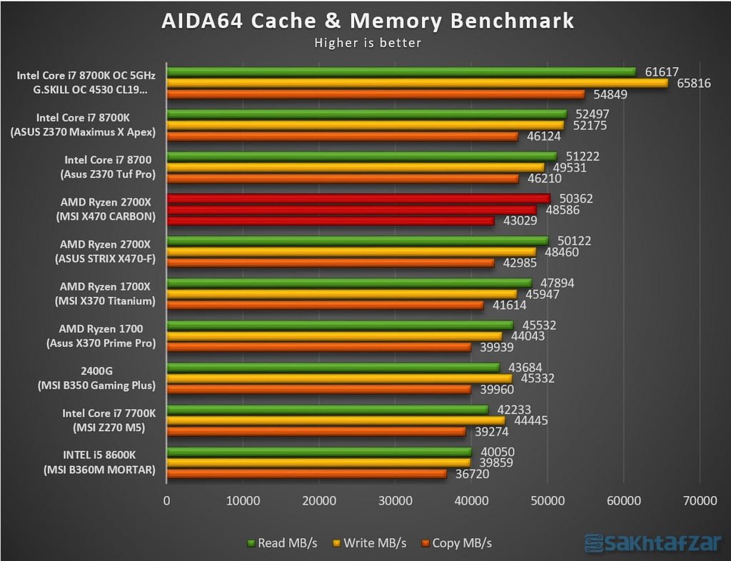 تست کش و حافظه AIDA64 به خوبی میزان پهنای باند در اختیار پردازنده را نشان می دهد. همانطور که در تصویر مشاهده می کنید این مادربرد بهترین عملکرد X470 را برای خود ثبت کرد.