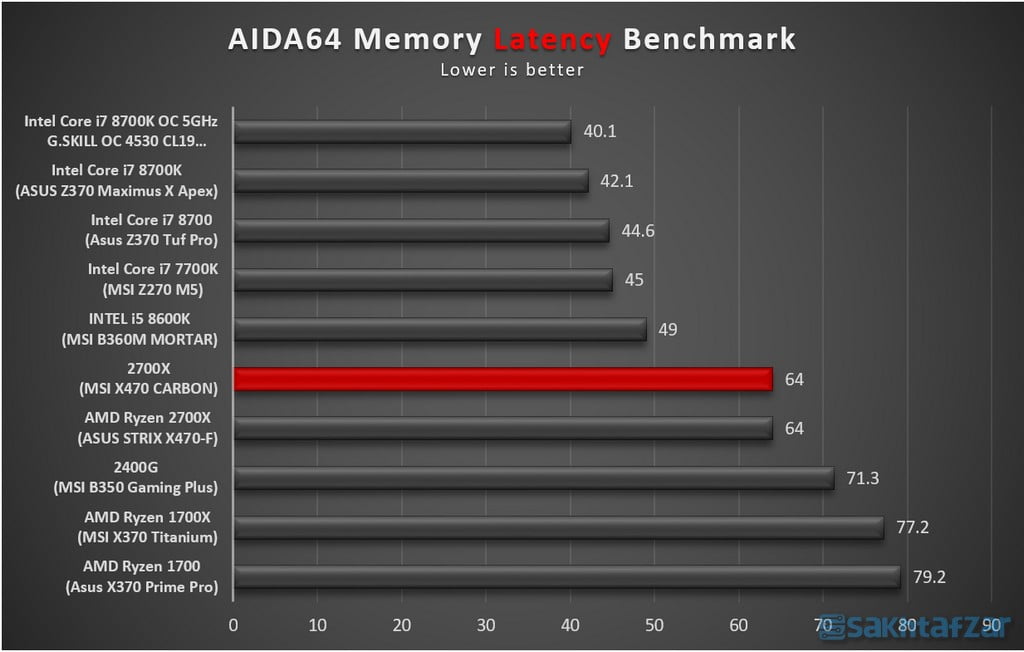 در تست سرعت تاخیر رم، می توان پیشرفت AMD را در ارتقای 2700X نظاره کرد. درحالیکه 1700X دارای زمان تاخیر بالای 75 نانوثانیه است، 2700X می تواند تاخیری در حوالی 64 نانو ثانیه داشته باشد. البته هنوز فاصله زیادی با رقبای اینتلی دارد .