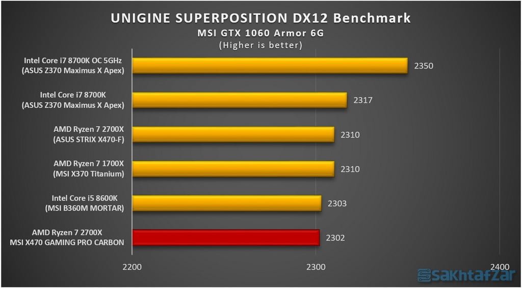 با تست Unigine Superposition به سراغ بحث گیمینگ می رویم. در اینجا تقریبا امتیاز ثبت شده برای 2700X از i5 8600K نیز کمتر است.