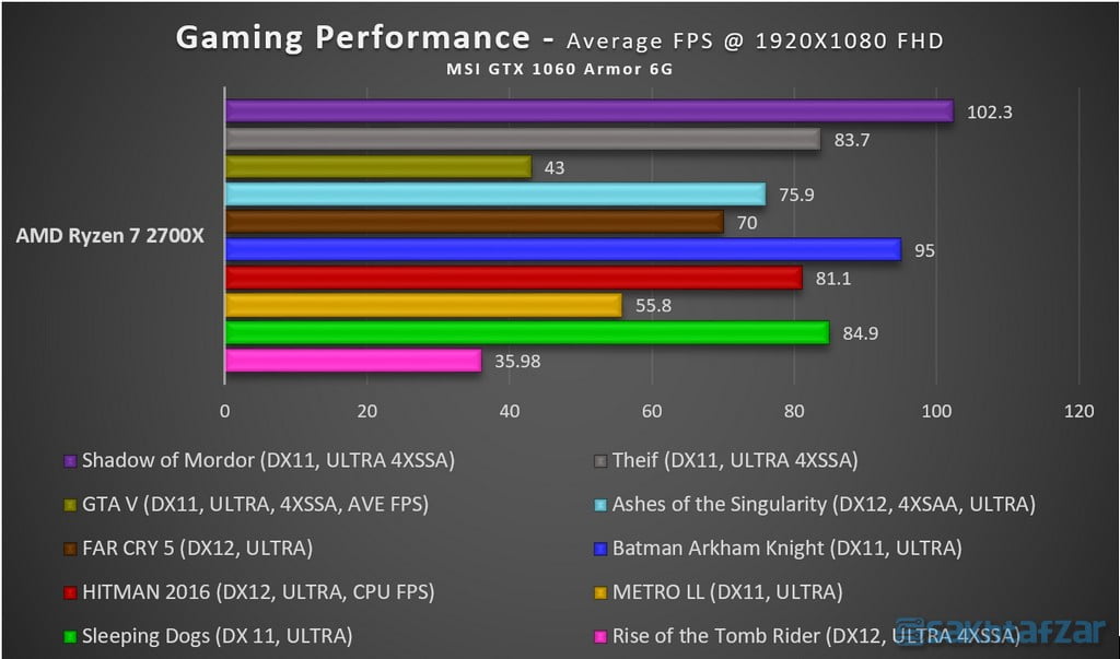 از این مقاله به بعد بازی FAR CRY 5 جایگزین Bioshock infinite می شود و تست آن در جدول بازی های 10 گانه سخت افزار می آید. کلیه بازی ها در دقت 1920×1080 آزمایش شده اند که همچنان پرطرفدارترین و عمومی ترین شکل بازی در میان کاربران است. در اغلب تست های این بازی ها، 2700x به خوبی ظاهر شد و توانست بیش از 60 فریم خروجی را برای کارت گرافیک ما به ارمغان آورد.