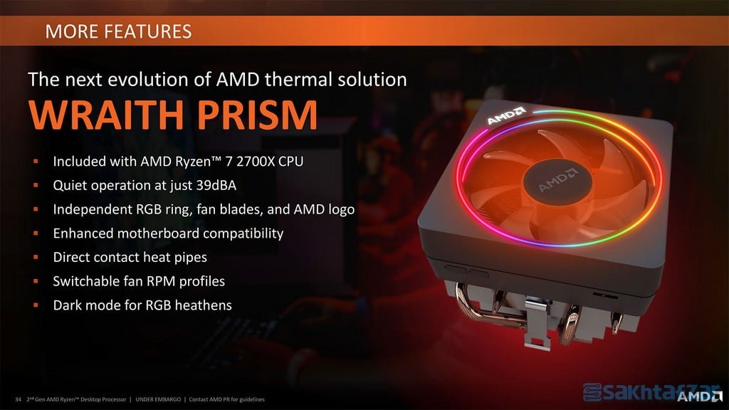 کولر زیبای Wraith Prism که به همراه پردازنده Ryzen 7 2700X عرضه خواهد شد از ویژگی های منحصر به فردی از جمله پشتیبانی از نورپردازی RGB و همچنین دو پروفایل برای تنظیم حداکثر و حداقل دور برای گردش فن است.