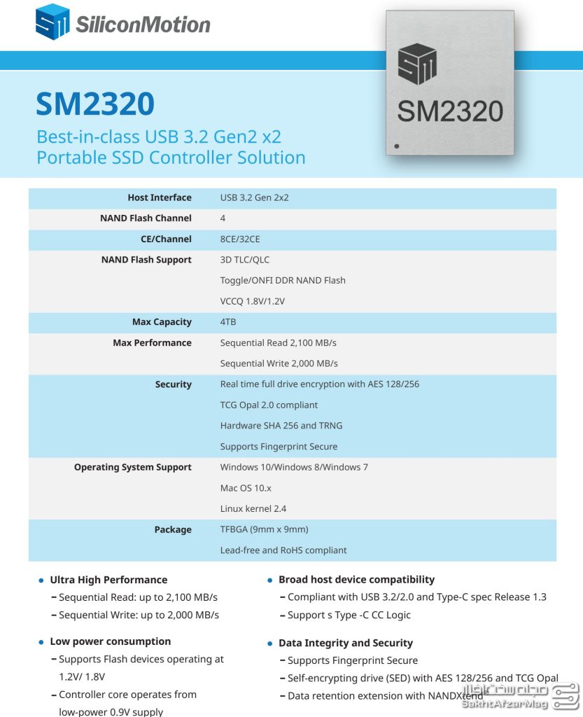 کنترلر SM2320 محصول سال 2021 شرکت سیلیکون موشن است. این کنترلر همانطور که در تصویر مشخصات آن را ملاحظه میکنید، از سرعت خواندن و نوشتن متوالی به ترتیب 2100MB/s و 2000MB/s پشتیبانی میکند.