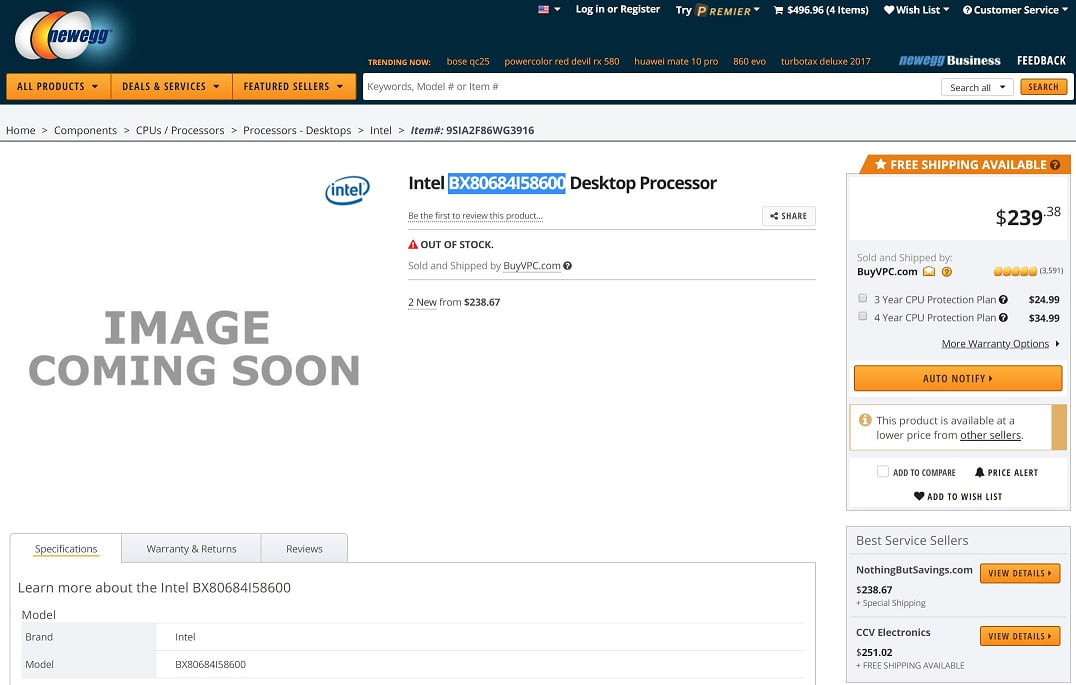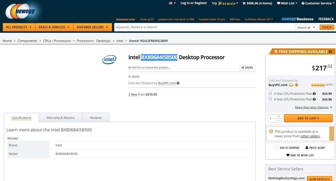 دو پردازنده Intel Core i5-8500 و i5-8600 از سری مدل های ضریب بسته، از جمله این محصولات هستند. این دو محصول با شناسه های فنی BX80684I58500 و BX80684I58600 علامت گذاری شده و دو محصول دیگر که از سری مدل های ارزان قیمت دسکتاپ هستند در گروه G49xx ها قیمت گذاری شده اند. Intel Core i5-8500 با قیمت 216 دلار به فروش خواهد رسید و i5-8600 نیز دارای برچسب قیمت 240 دلار است. جالب است بدانید که در حال حاضر می توان مدل های i5-8500 و G4920 را در این وب سایت به سبد کالای خرید اضافه نمود.
