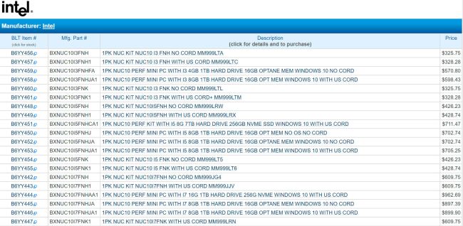 با توجه به لیست BLT مدلهای Core i7 و Core i5 و Core i3 با قیمتهای 609.75 دلار و 428.74 دلار و 328.28 دلار فروخته میشوند. همچنین این کیتهای NUC در نسخههای متفاوتی با گزینههای حافظه رم و حافظههای ذخیره سازی مختلف موجود هستند. گزینههای 4 و 8 و 16 گیگابایت برای حافظه رم، تا 16 گیگابایت حافظه Optane، تا 256 گیگابایت حافظه SSD یا 1 ترابایت حافظه HDD از جمله گزینههای مختلف هستند.