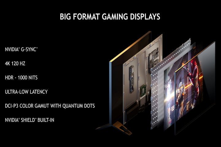 نرخ بومی فرکانس پنل در BFGD برابر با 120 هرتز است که این نرخ با کمک G-Sync و بدون نیاز به سیستم های نرم افزاری ارائه می گردد. به دلیل پشتیبانی از خاصیت HDR، شدت نور آن به 1000 نیت رسیده و از طیف DCI-P3 نیز پشتیبانی به عمل می آورد. سازگاری با کنسول های بازی و کنسول NVIDIA SHIELD، پشتیبانی داخلی از NVIDIA GameStream، اتصال به انواع لپ تاپ، کدگشایی محتوای 4K از Netflix، Amazon Video، YouTube و Hulu و سامانه کنترل دقیق نرخ فریم از جمله دیگر قابلیت های این نمایشگر است. این نمایشگر تحت عناوین تجاری مانند ایسوس ROG راهی بازار می گردد.