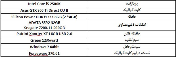 براي تست مادربورد از سيستمي که مشخصات آن در جدول درج شدهاست، استفاده کرديم.