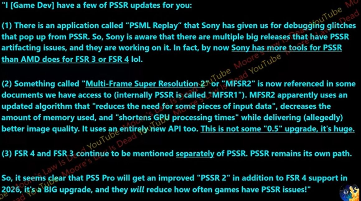 کانال Moore’s Law Is Dead که نخستین بار جزئیات PSSR را پیش از رونمایی PS5 Pro فاش کرد، در می 2025 گزارش داد سونی در حال توسعه PSSR2 با هدف دستیابی به کیفیت تصویر بهتر با منابع کمتر است. این منبع اکنون جزئیات بیشتری منتشر کرده است.
